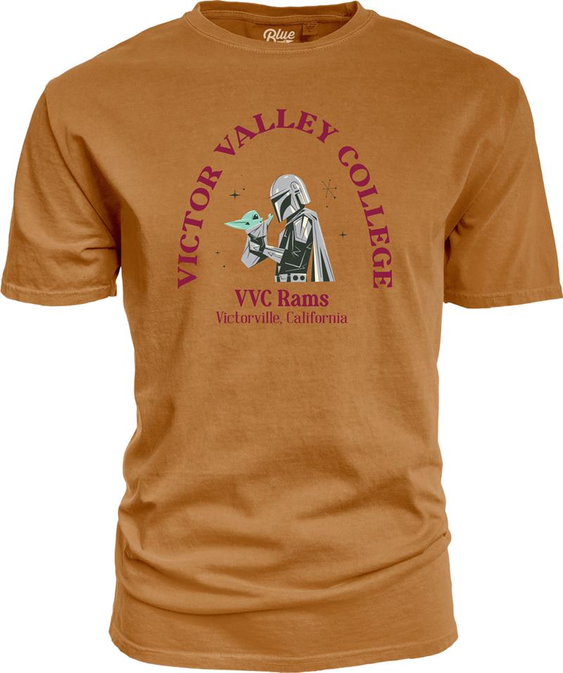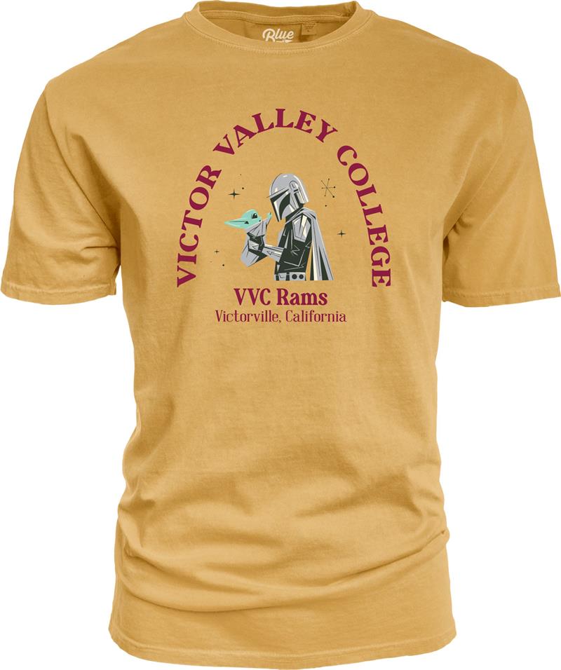 Join the Mandalorian and Grogu on your Victor Valley College journey! This vibrant tee features the beloved duo in classic collegiate styling with "Victor Valley College VVC Rams" proudly displayed. Perfect for Star Wars fans who want to rep their school with galactic flair.